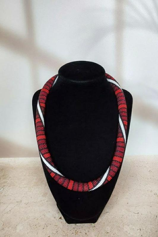 Яркий и оригинальный жгут из бисера имеет сочетания 4 оттенков красного. Диметр жгута 1.5 см, длина - 53 см. В комплекте есть браслет должной 20 см.