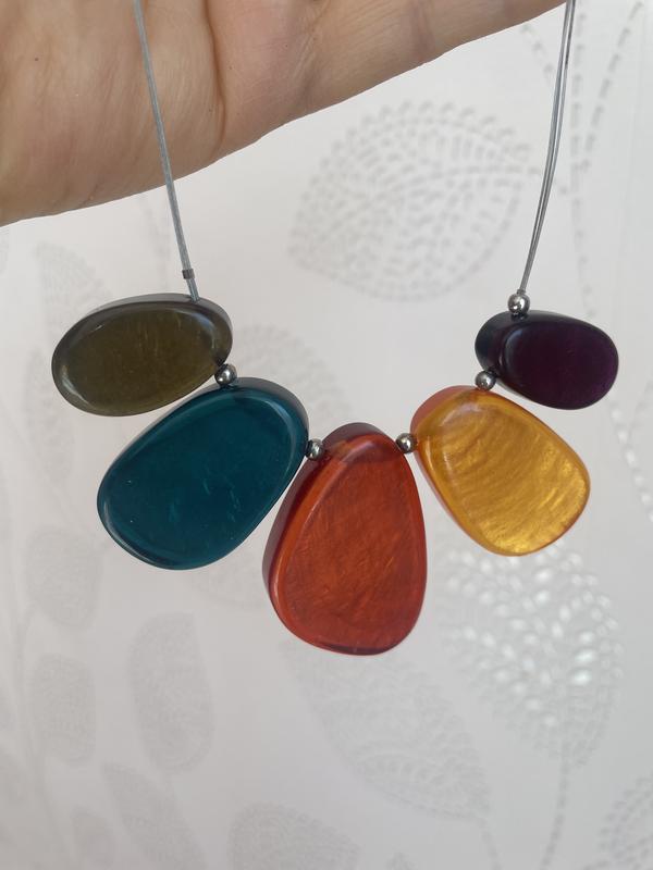 Стильное оригинальное короткое колье от Marks & Sper, с разноцветными вставками. Есть некритические нюансы: потемнение на дротике с одной стороны, потертость на застежке, отсутствие одной серебристой бусины. Длина: 41- 42 см (плюс 7 см удлиняющая цепочка)