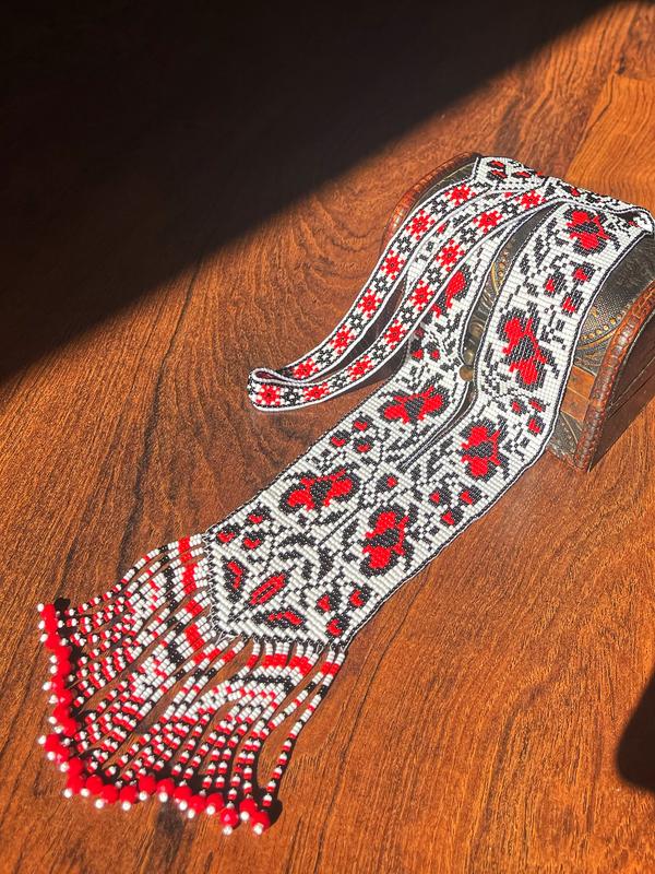 Длина с бахромой +/- 62-63 см. Ширина +/- 8-9 см. Гердан выполнен в технике станкового ткачества и чешского бисера Украшение имеется в наличии, а также выполняется под заказ.