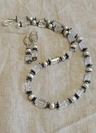 горный хрусталь, жемчуг натуральный камень чокер, колье, сережки. серебро 925.