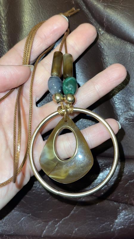 Стильное, долгое украшение на прочном шнурке. Металл и пластик. Выглядит стильно и аутентично. В носке не была.