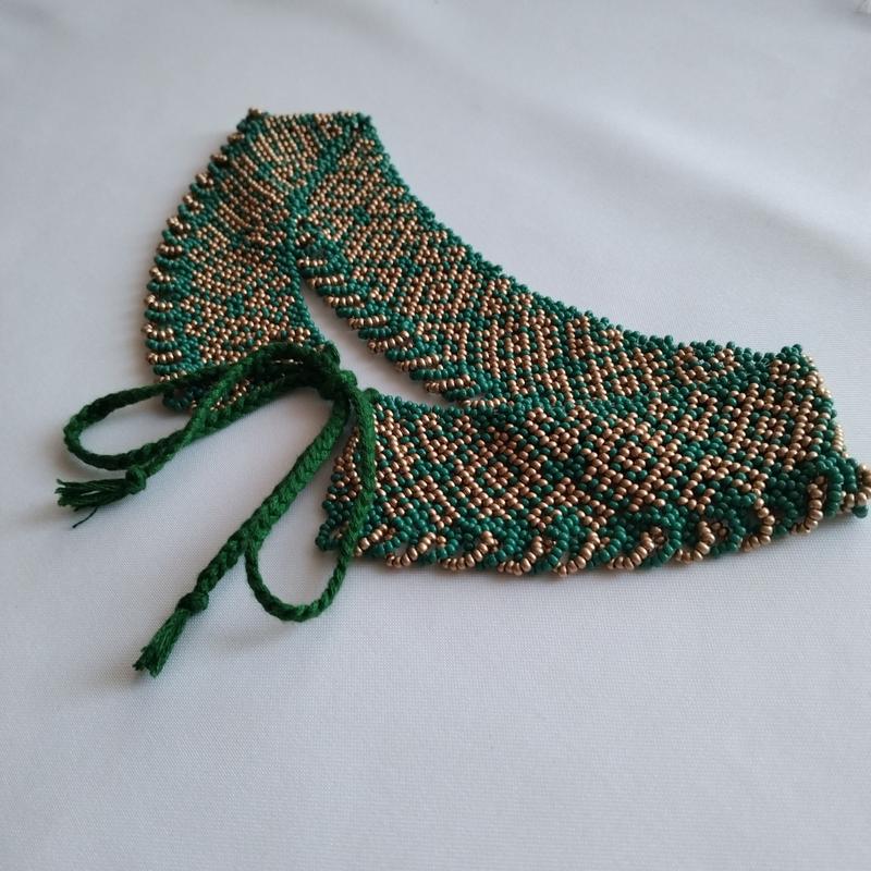 Эта изысканная силика ручной работы станет отличным дополнением к вашему гардеробу, добавляя нотку украинского колорита и элегантности. Изготовлена из высококачественного чешского бисера двух цветов: насыщенного изумрудного и блестящего золотистого.