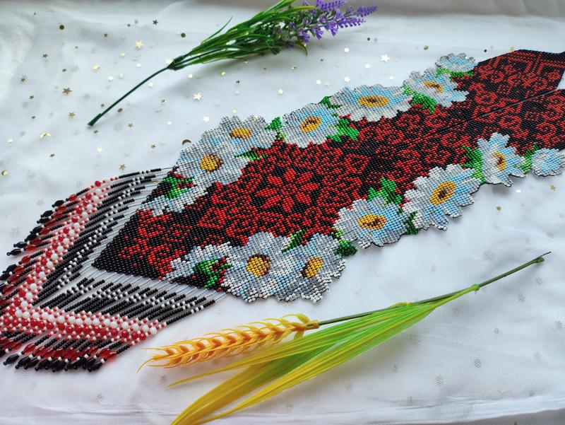 Гердан сделан из чешского бисера первой категории по схеме Катерины Степась. Невероятное сочетание орнамента с цветами подойдет на любой образ., повседневный или праздничный. длина шейного пояска - 27 см длина изделия- 49 см ширина кулона - 15 см