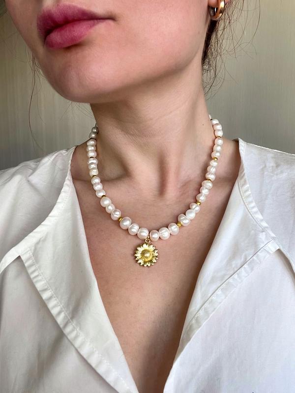 Натуральные речные жемчужины, подвеска «подсолнечник» позолоченная фурнитура, гипоаллергенная, не темнеет. Ручная работа. Длина ожерелья 41 см