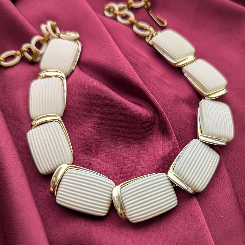 Винтажное колье LISNER - воплощение элегантной изысканности Мягкий белый рельефный декор, окутаемый нежным золотистым отблеском, создает атмосферу уюта и непревзойденной утонченности. Линии, сочетающие классическую простоту и современную грациозность, нежно подчеркивают красоту этого колье, а регулируемая по длине цепочка добавляет легкости и элегантной пластичности. LISNER - легендарный американский бренд, основанный в 1904 году, специализировавшийся на разработке украшений середины ХХ века. Изделия бренда стали символом изысканности и стиля, а после прекращения его деятельности в 1979 году они приобрели большую ценность среди коллекционеров. Каждое изделие LISNER — это не только утонченный аксессуар, но и часть истории, что остается актуальной до сегодняшнего дня. Хорошее винтажное состояние. Длина колье : 43 см.