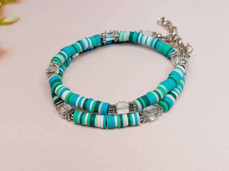 Ожерелье 45см. + 5см. цепочка-удлинитель: - плоские бусины из полимерной глины, 6мм, зелено-голубой цвет; - латунные квадратные вставки-бусинки 6х6мм, цвет античное серебро; - бусины-кубики стеклянные с гальваническим покрытием, прозрачные, 6х6мм; - фурнитура железная, цвета античного серебра; - на ювелирном тросике. Легкі. Приятные на ощупь.
