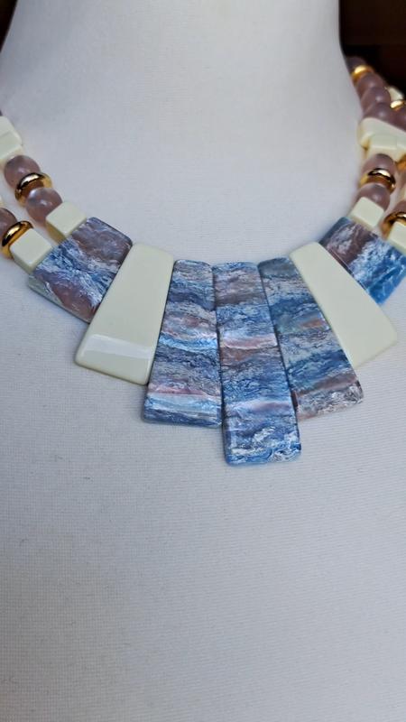 Кольорова гама цього кольє просто дивовижна, справді! 👌 Для мене - це як світанок десь на морі 🩷💙 Ніжно! Чарівно! Захоплююче! 😇 Матеріал: люцит Стан: відмінний вінтажний ❗️Колір такий, як у руці. На манекені виглядає трохи темніше, так падало світло! Зворотній бік блакитного кольору! 💙 Загальна довжина близько 47 см (внутрішній діаметр).