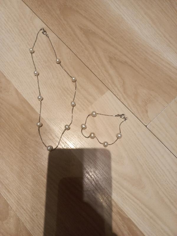 Продаю серебряный набор с жемчужинами. Браслет на руку, і на шию. Размер колье-40 см, браслет на руку -17 см.