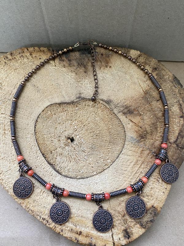 На дротовій основі. Повністю фурнітура мідного кольору. Є вкраплення персикового коралу. Дукати зі старовинним візерунком. Є подовжувач.