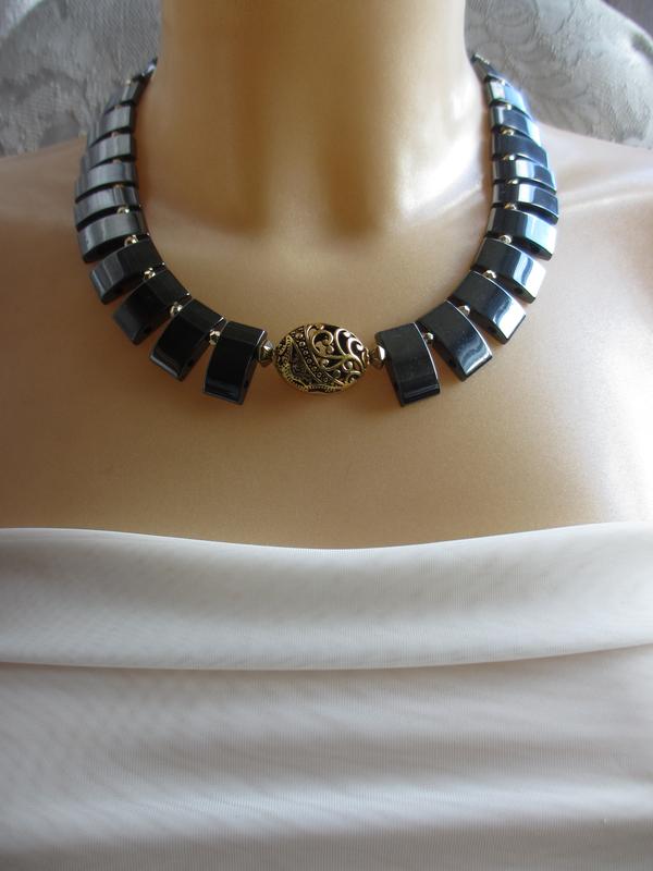 Строгое элегантное колье из традиционного черного гематита и бусин позолоченного гематита. Вставка крупная ажурная, цвета золота. Очень красивое, сдержанное украшение. Длина 45 см. Возврат не предусмотрен. Наличие уточняйте предварительно. Не забудьте просмотреть "все товары продавца" и найдете еще много интересного. Каждое украшение ручной работы в единственном экземпляре.