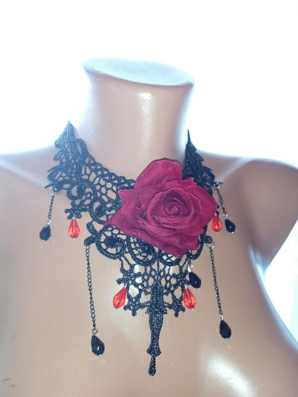 Уникальное украшение ручной работы в стиле dark romantic и goth. Черное кружево, нежно облегающее шею, украшенное бархатистой розой цвета бордо. Цепочки с хрустальными каплями добавляют драматичности и изысканности. ✨ Идеально для: тематических вечеринок (Halloween, готические вечера) фотосессий и TikTok образов cosplay (вампир, ведьма, темная королева) романтических, неформальных, альтернативных стилизаций 🖤 Детали: Материал: гипюровое кружево, текстильная роза, стеклянные/акриловые бусины Цвет: черный + темно-бордовый + гранатовые акценты Застежка: регулируемая (на цепочке или завязках) Длина: универсальный размер