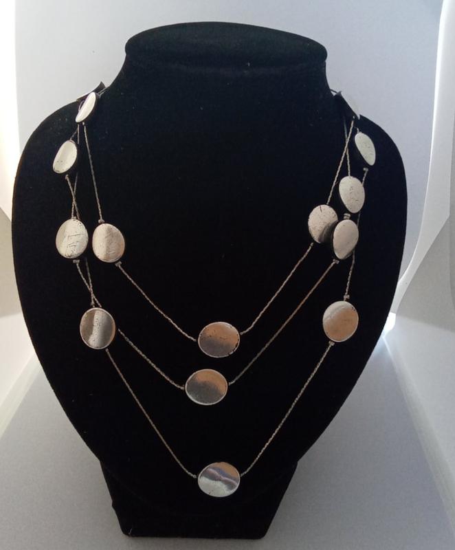 Трехрядное колье серебристого цвета. Пластиковые круги на тонкой проводе. Колье легкое, длина 50 см. Имеет удлиняющую цепочку 10 см. Украшение современной.