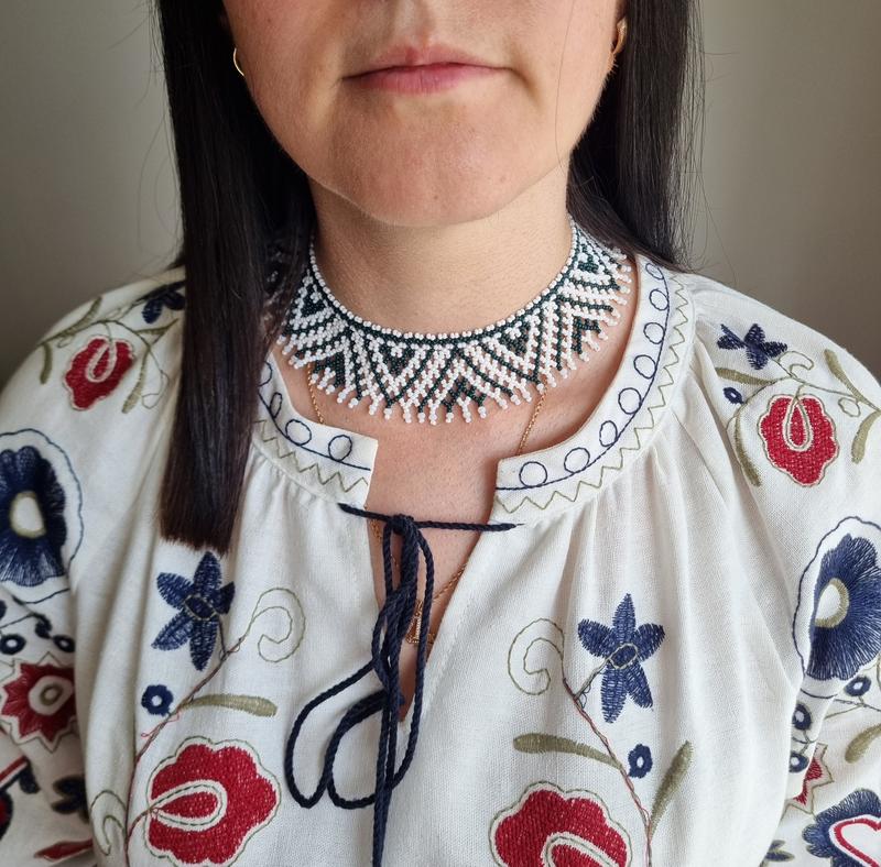 Традиционная украинская силянка в бело-зеленом цвете. Отличный аксессуар, который подойдет к праздничному образу и на каждый день. Изготовлен из качественных материалов: 🔸️чешского бисера; 🔸️хрусталя; 🔸️застежка из нержавеющей стали. Длина с застежкой - 35 см + 7 см цепочка удлинитель. Ширина - 3,8 см Если нужно другой размер Пишите мне об этом при заказе. В данном случае время изготовления 2-3 рабочие дни.