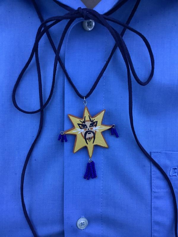 Прикраса на шию у вигляді левика або ж у вигляді Різдвяної зірки (кому як більше подобається). ПРИКРАСА - ДВОХСТОРОННЯ Прикраса виконана вручну з глини. Також є фурнітура зі сталі. Покрита глянцевим лаком, який захистить від потрапляння води у прикрасу. Розміри: Ширина: 4,8см Довжина: 7см (з урахуванням бісеру) Також разом з прикрасою йде замшевий шнур (2метри).