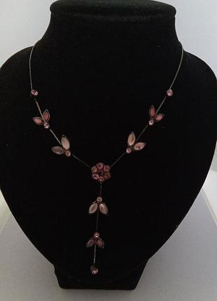Колье женское, цветочный мотив. Украшение выполнено из ювелирного сплава черного цвета. Вставки пластик разных оттенков розового цвета. Длина колье 38 см, центральный подвес 6 см., удлинительная цепочка 8 см. Колье стильное.