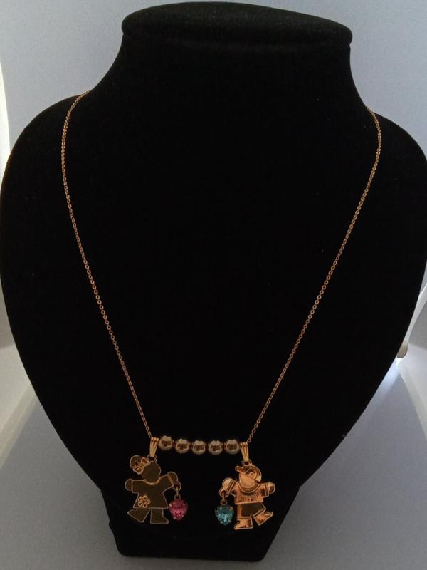 Колье с подвесом: Мальчик и девочка. Украшение выполнено из ювелирного сплава золотого цвета. Вставки кристаллы голубого и розового цвета. Колье имеет длину 45 см. Украшение современное, меет маркировку.