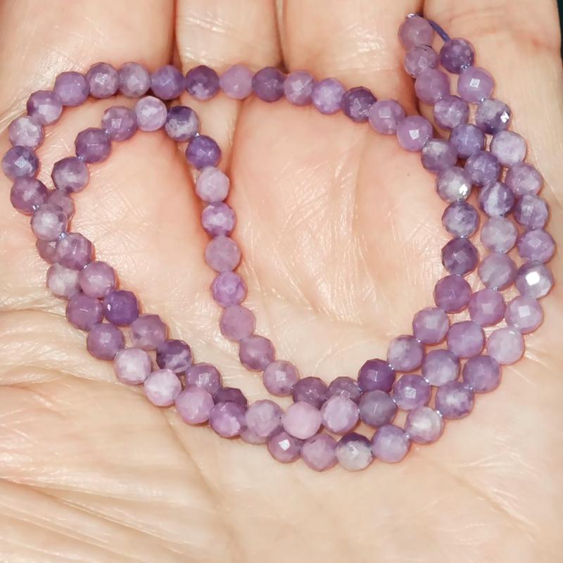 ## Бусы из натурального Лепидолита. Камни - размер мм. Бусы - размер (длина) см. Лепидолит - сиренево-серый или розовый минерал из группы слюд. Он является литий содержащим минералом и служит вторичным источником этого металла. Лепидолит обладает следующими свойствами: - Значение: Лепидолит, который часто называют "камнем мира" или "камнем бабушки", известен своей способностью приносить спокойствие и равновесие, особенно в переходные периоды и во время перемен. - Целительные свойства: Этот кристалл известен своей способностью успокаивать тревогу, снимать депрессию и способствовать эмоциональному исцелению, уравновешивая разум и дух, в первую очередь благодаря содержанию лития. - Защита: Лепидолит защищает владельца от внешних воздействий, поглощает электромагнитное загрязнение и обеспечивает психическую защиту, отклоняя негативные энергии. - Использование: Люди используют лепидолит в различных формах, например, в ювелирных украшениях или размещая камень в стратегически важных местах, чтобы использовать его успокаивающую энергию, стабилизировать перепады настроения и способствовать спокойному сну. - Уход: Для ухода за лепидолитом рекомендуется регулярно очищать его, помещая под лунный свет, смачивая шалфеем или другими кристаллами, например селенитом, а также избегать воздействия воды и солнечного света, чтобы сохранить его яркий сиреневый оттенок.