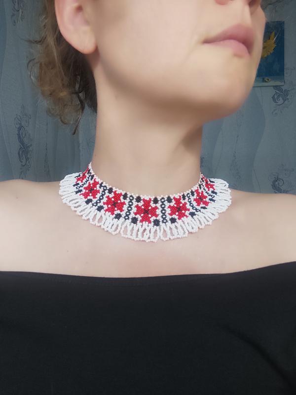 Выполнена из чешского бисера длиной 33.5см+5см застежка с цепочкой, ширина 4.5см.