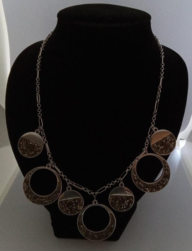 Колье женское с маркуванями. Украшение изготовлено из ювелирного сплава серебряного цвета. Украшение украшено кристаллами серого цвета, имитация пирита. Общая длина колье 50 см, основа украшения 45 см, удлинительная цепочка 8 см. Украшение очень стильное.