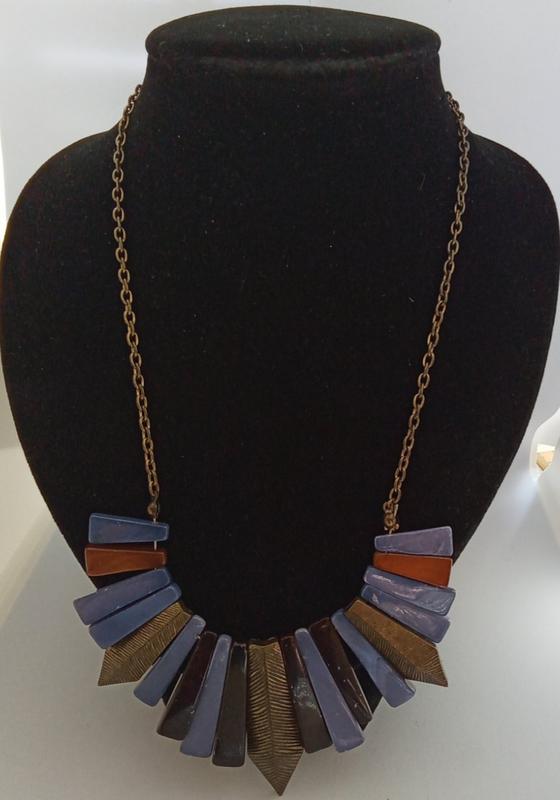Женское колье выполнено из ювелирного сплава цвета латуни. Вставки из разноцветного перламутра. / черный, красный, сиреневый / Длина украшения 45 см, удлинительная цепочка 7 см. Центральная часть колье 5 * 10 см. Украшение стильная.