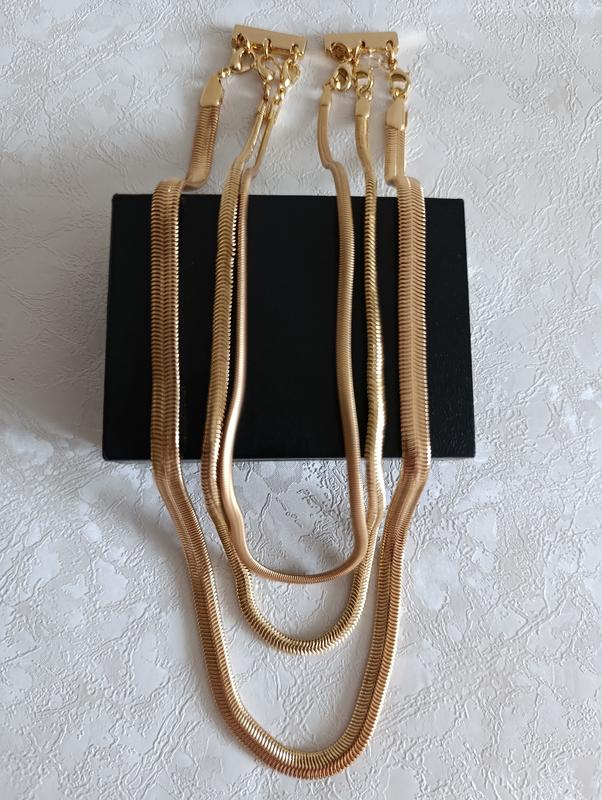 Стильное трехрядное колье на магнитной застежке. Можно носить цепочки по отдельности.Длина цепочек от 37 см до 47 см. Оплата на карту. Обмену нет.