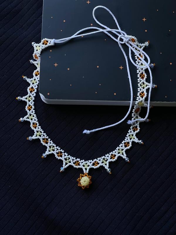 Прикраса на шию, кольє ручної роботи з обʼємною двосторонньою підвіскою у вигляді сонця, зроблено з чеського бісеру, скляних намистин та бавовняного шнура. Завʼязки дозволяють регулювати довжину, зручні на шиї, знімаються (можна замінити на свої за бажанням). Довжина 36 см + 32 см (завʼязки), ширина разом з намистинами 2 см.