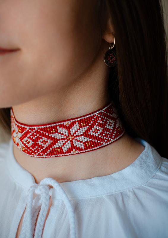 Авторский гердан на шею со звездами и ромбиками. На фоне темно-красного матового бисера сияют четыре звездочки блестящего жемчужного оттенка с золотистыми вкраплениями. Украшение яркое, контрастное, красиво дополнит образ с вышиванкой или белой рубашкой. С этим герданом вы точно не останетесь незамеченной:) Длина украшения 28 см, завязочки по 36 см каждая позволяют идеально отрегулировать длину. Использовано высококачественный японский бисер, ниточки хлопковые и прочные нейлоновые, фурнитура (бусины на кисточках) позолоченные. Уход: беречь от падений, не распылять на украшения парфюма и другие спиртсодержащие вещества. Хранить в темном месте, вдали от солнечных лучей.