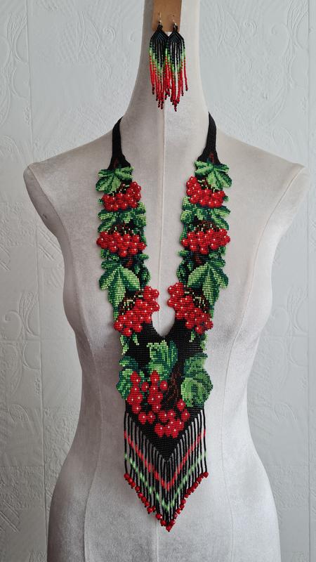 Этот набор бисероплетия ручной работы состоит из потрясающего колье (гердана) и серег в тон, украшенных гроздьями красных ягод калины и зеленых листьев - символа украинского наследия, красоты и стойкости.Вамисто может похвастаться сложным дизайном с многослойными узорами из бусин и декоративным вырезом по центру, а серьги дополняют образ плавным, ярким стилем. Идеальный акцентный элемент для традиционной или современной одежды. Эти изделия также можно приобрести отдельно. Цены изделий: Гердан - 3000 грн Серьги - 600 грн Размеры Гердана: длина: 58 см ширина кулона: 10 см Размер серег: длина: 9 см материалы: мелкие бусинки чешский бисер, нитки полистер, фурнитура медицинский сплав Цвета: черный, зеленый, красный, белый