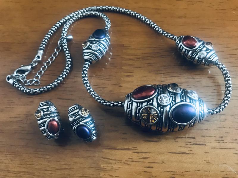 Ціна сережок 392грн Ціна за комплект 1000грн Тип застібки: Карабін (+4 см ланцюжок) Довжина: 46 см. Матеріал: Мідний сплав Покриття: Родій Камінь: Фіаніт(нат.) Колір: Жовтий Колір2: Кришталевий Колір 3: Срібний Вага: 79,4 г