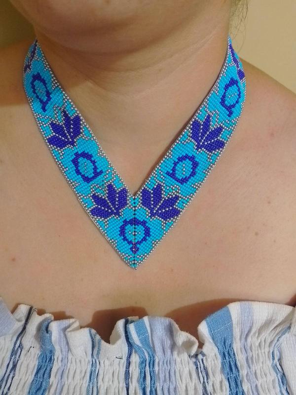 Угловой гердан изготовлен из качественного бисера. Длина-по внешнему краю - 34 см., ширина - 3,3 см. Застежки(завязки) - по 22 см каждая, длина регулируется завязками.