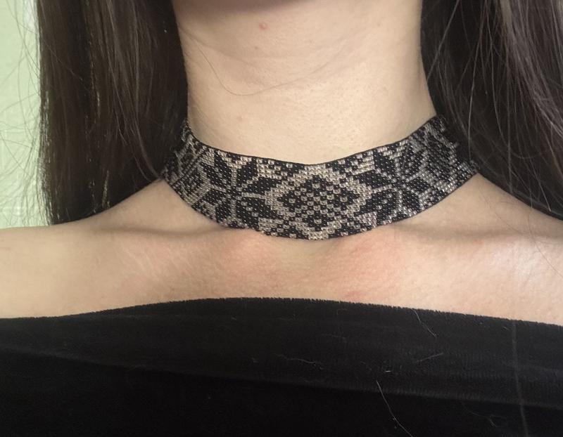 Гердан ручної роботи,застібка нержавіюча сталь,чудово впишеться в будь який гардероб,за рахунок поєднанням універсальних кольорів В подарунок до нього йде чокер з молочною трояндою,в елегантному пакуванні. Довжина 31 см