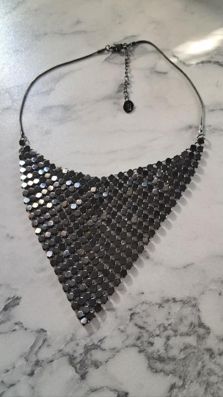 Стильное колье из серого металла с треугольной подвеской, которая бликует под светом, и которую можно носить с обеих сторон, для достижения желаемого эффекта.