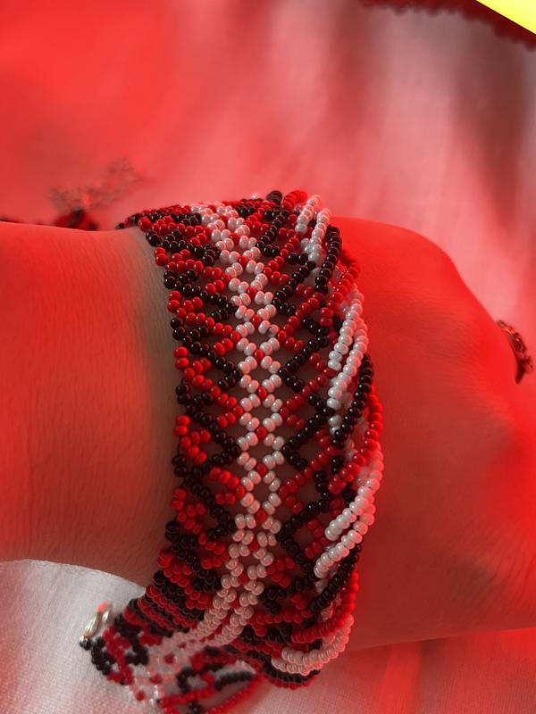 Ручна робота з чеського бісеру в поєднанні кольорів, що не потребують пояснень — червоний, чорний і білий. - Натхненна українською вишивкою Зручно сидить на шиї •Металева застібка з регулюванням • Довжина: 32,5 см \ Ширина: 3,6 см