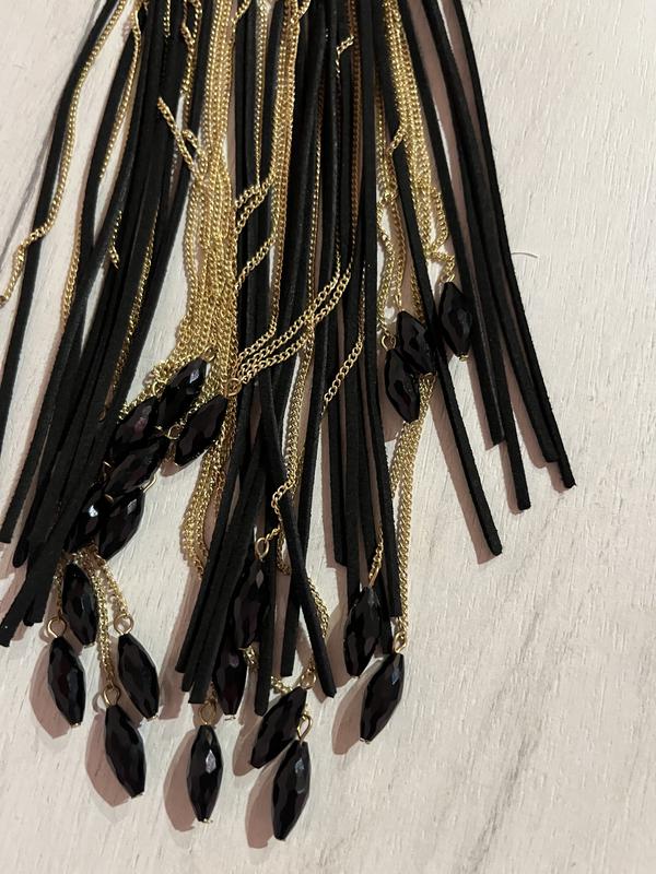 Шикарное черное ожерелье, декорированное кожаными полосками и камнями