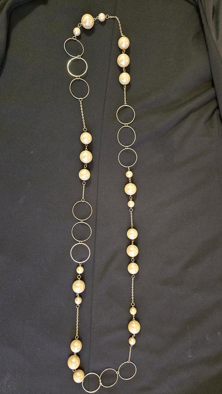 Красивое длинное ожерелье из крупных жемчужин и колец с цепочками. Длина 80 см. Диаметр крупной жемчужин 23 мм, диаметр немного меньших жемчужин 20 мм, диаметр колец 38 мм. Яркое акцентное ожерелье, которое не останется без внимания. Можно носить в один ряд или два ряда.