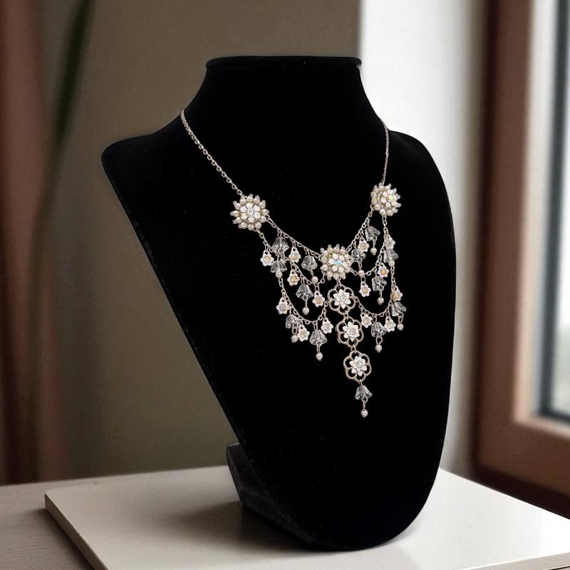Винтажное колье Kirks Folly с цветками. В подарочной коробке. Выполнено из бижутерного сплава серебряного тона. Инкрустировано кристаллами Aurora Borealis. Длина цепочки - 38-47 см. Отличное состояние.
