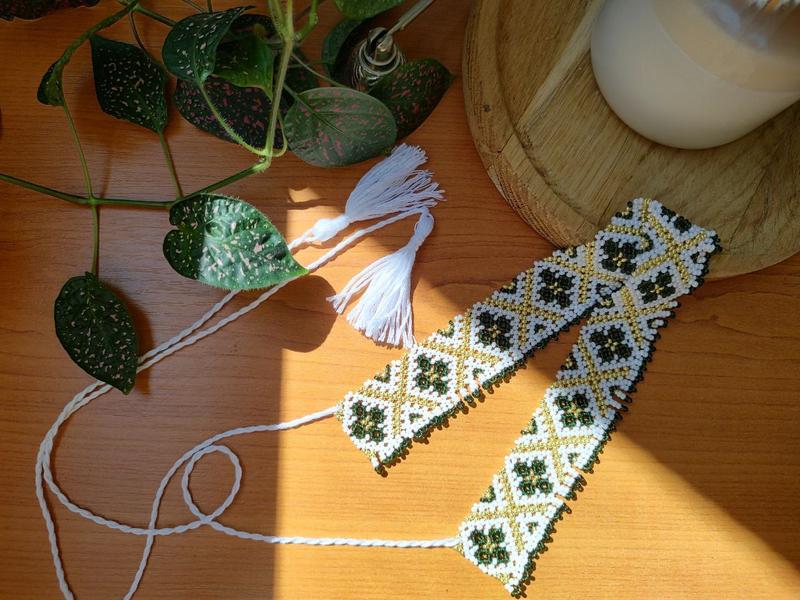 Бісерні прикраси- це спосіб виразити себе, показати свою індивідуальність та підтримати тренди. Ця силянка гармонійно поєднує традиційне та сучасне мистецтво та несе своєю символікою глибокий етнічний зміст. Виконана з чеського бісеру, кольори :темний зелений, білий, золотий. Вага прикраси - 27.5гр. Довжина - 32 см. Ширина - 3см. На зав´язці з китицями. Відправка Укрпоштою можлива по повній оплаті.