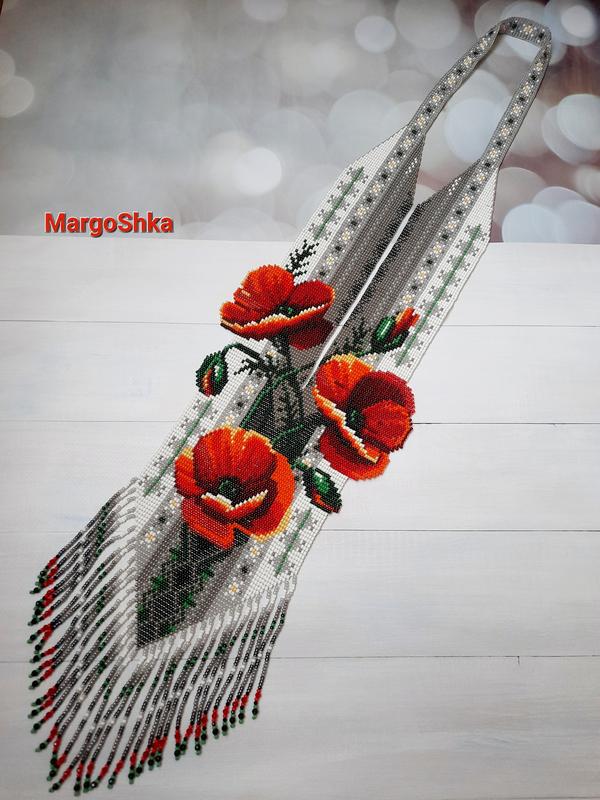 Красивный гердан с яркими маками станет изюминкой Вашего этно-образа! Изготовлен из отборного чешского бисера. Низки с добавлением стеклянных бусин, переливающихся на свету. Вес изделия 147 грамм. Комфортно одевается через голову. Красиво ложится по груди. При росте 170, длина чуть ниже пупка.