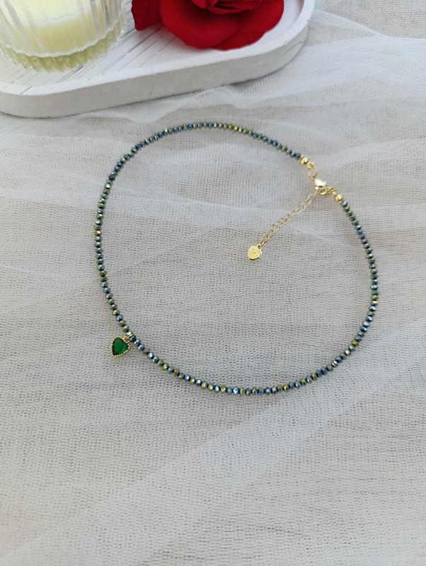 Тоненький чокер на шею из изумрудного хрусталя с нежной подвеской сердце