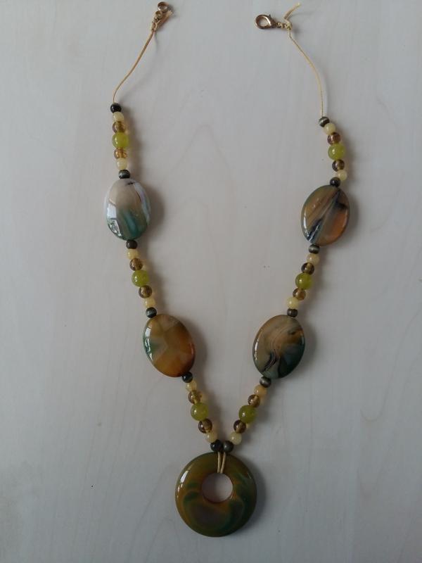 Красивое ожерелье с бусинами из жёлто-зелёного агата. Все камни имеют неповторимые узоры, можно выкладывать на обе стороны. Длина ожерелья: 47 см