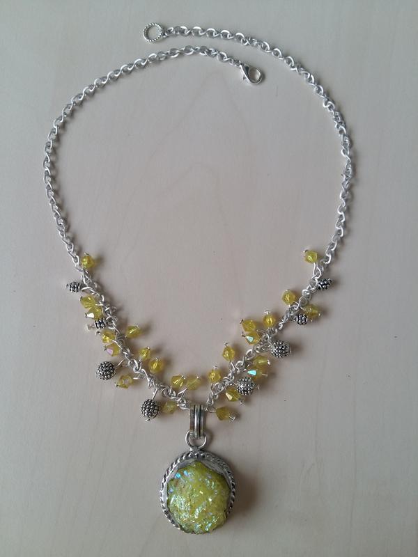 Нежное, лимонно-жёлтое колье с друзой агата с переливающимся напылением. Длина: 43 см Размер друзы: 2,7 х 2,5 см