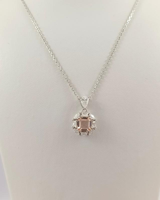Характеристика кольє : Метал: срібло Проба: 925. Виріб апробовано пробірною палатою України Покриття: родій Вставки: морганіт синт., цирконій Вага: 3,50-3,54 гр Довжина: 39-44 см Довжина підвіски (з вушком): 19 мм Ширина підвіски: 11 мм Розмір морганіту: 7*7 мм