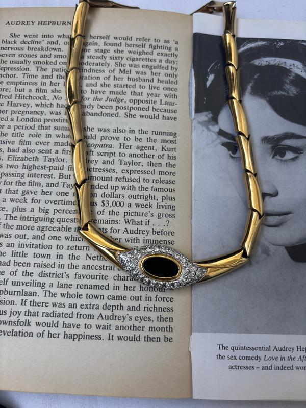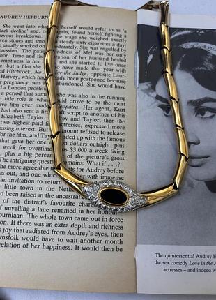 То 💛-1250❣️ Дизайн: Намисто складається з жорстких сегментів, що утворюють гладкі вигнуті лінії. Довжина 42❣️В центрі розташована велика овальна вставка з чорним каменем, оточеним білими стразами. Така конструкція часто називається "комір" або "чокер". • Матеріал: Золотистий колір основи та білі кристали-стрази свідчать про те, що це, найімовірніше, костюмна біжутерія, а не виріб із дорогоцінних металів. Це підкреслює і характерна для біжутерії застібка, хоча її на фото не видно. • Стиль: Цей стиль дуже нагадує ювелірні вироби епохи Art Deco або Retro (приблизно 1930-1950-ті роки), для яких характерні геометричні форми, сміливі поєднання кольорів і використання великих каменів (часто імітації). Пізніше, в 1960-х роках, подібні прикраси також були популярними.