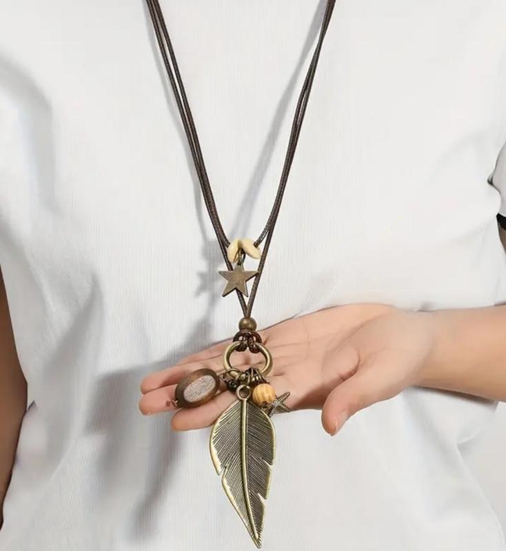 🪶⭐ Двухуровневое колье с подвесками "перо и звездочка" с разноцветными деревянными бусинами. Шнурок — коричневая вощеная нитка 2,5 мм. Застежка на карабин. Цвет карабина ганблек. Длина колье регулируется удлинительной цепочкой. Размер: длина 1 уровень 65 см, второй уровень 75 см + 5 см цепочка регулировки длины. !!!!ВНИМАНИЕ!!! Цвет и форма подвески "перышко" может незначительно отличаться в данной модели колье. Перышко есть темное и более золотистое - двух типов. Уточняйте перед заказом у продавца. Подобные колье в ассортименте есть в продаже (последние 2 фото).