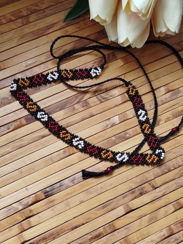 Выполнен из чешского бисера Длина 33 см, регулируется завязками Длина завязки 29 см Ширина 1 см Ручная работа.