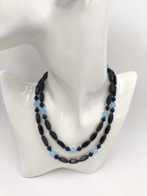 Винтажные бусы черное стекло красивой формы с акцентными вставками голубого цвета. Состояние б/у, хорошое Приблизительная длина изделия 76см.