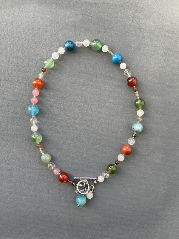 Об’ємне намисто з камінчиками у природніх відтінках🍃 та зручною застібкою тогл. Можна носити двома варіантами - застібкою наперед або назад. Застібка прикрашена підвісними камінцями 🫧 Матеріали: Агат, кварц, гірський кришталь, циркони, нержавіюча фурнітура. Також по індивідуальному замовленню можу зробити у комплект браслет чи анклет. Ціна: 500 грн Довжина без застібки - 38 см.