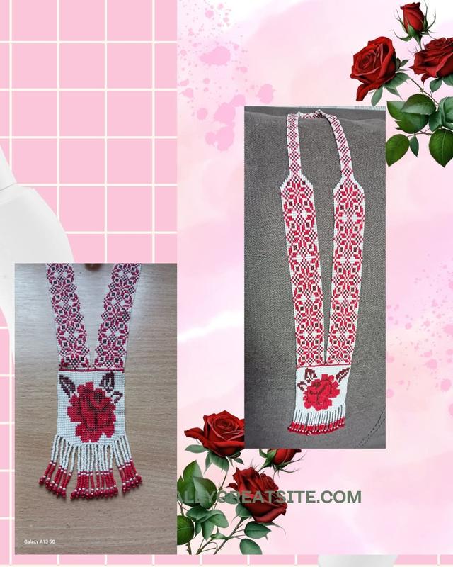 Гердан изготовлен из чешского бисера в технике гобеленового плетения. В работе использованы гарантированные бусины красного цвета на рядах. Моя авторская работа. Узоры взяты из схем народных вышивок.Роза олицетворяет в себе женскую красоту и невинность. Длина работы 48 см.