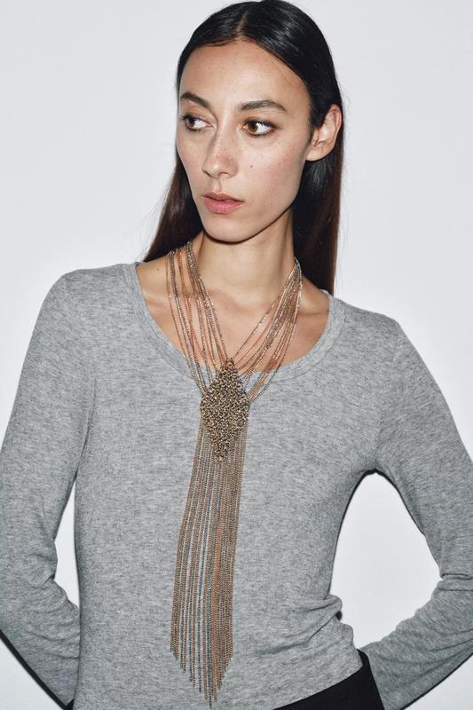 Ожерелье из нескольких металлических звеньев в виде цепочки с подвеской из комбинированных колец. Застежка-карабин.