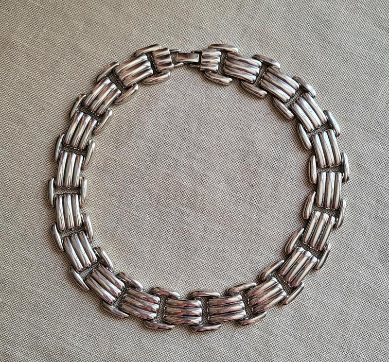 стильное, яркое массивное колье. Выглядит на теле просто шикарно, без преувеличений. Имеет отличное состояние - без нюансов. Такое случается редко:) Удивительно, что колье немаркированное. Имеет вес. Длина 41см, ширина 2 см.